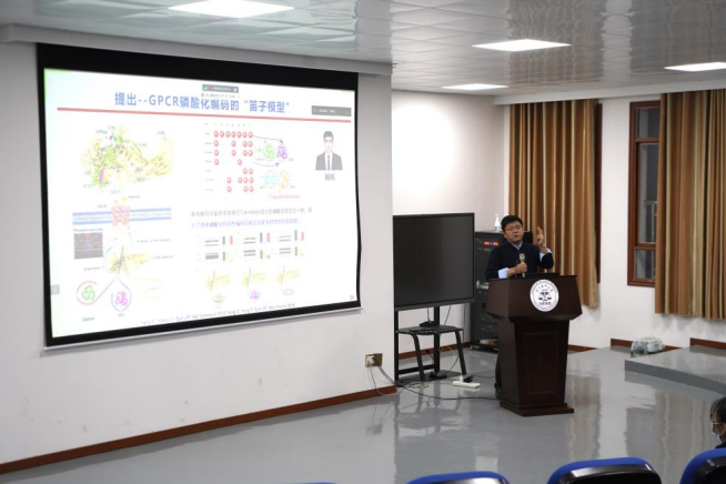 孙金鹏教授讲座的主题为“类固醇激素膜受体亚家族的发现和GPCR对微环境的感知”。讲座伊始,他介绍了自己在国外的研究经历、回国初期开展科研工作中遇到的困难以及克服困难后取得系列标志性成果的过程,勉励大家要有耐心,扎实打好科研基础,突破瓶颈期后一定会取得丰硕的成果。他解析了膜受体是感知细胞外信息的枢纽,将参与感知并决策,受体概念的提出和GPCR家族的发现,GPCR所感知的荷尔蒙等科学问题,同时介绍了课题组的主要研究方向及目前取得的重要学术成果。孙金鹏教授与现场师生积极互动交流,还介绍了目前法医领域有关动脉粥样硬化、神经损伤修复、新精神活性物质成瘾机制等方面的研究前景。